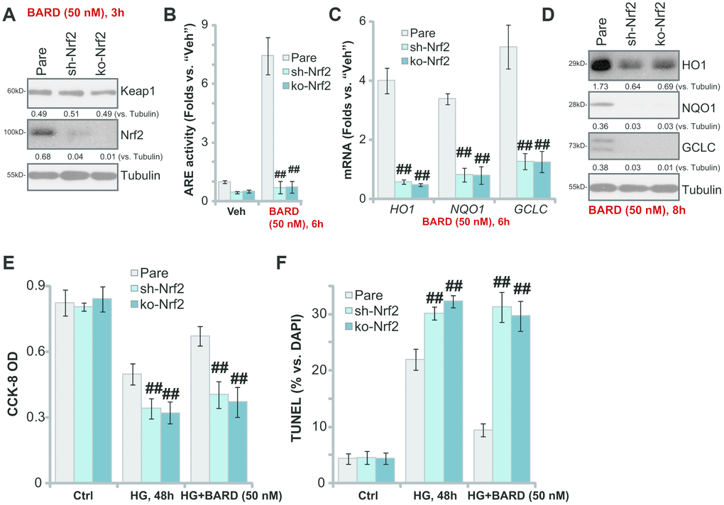 Figure 3. Nrf2 silencing or knockout blocks BARD-induced cytoprotection in HG-stimulated HUVECs. The stable HUVECs with Nrf2 shRNA lentiviral particles (“sh-Nrf2”) or the lenti-CRISPR-GFP-Nrf2 knockout (KO) construct (“ko-Nrf2”), as well as the parental control cells (“Pare”), were treated with Bardoxolone Methyl (BARD, at 50 nM) for applied time periods, expression of listed genes was tested by qPCR and Western blotting analyses (A, C, D); The relative ARE activity was examined as well (B); Alternatively, cells were pretreated with BARD (50 nM) for 1h, followed by HG stimulation and cultured for 48h, cell viability (CCK-8 assay, E) and apoptosis (nuclear TUNEL staining assay, F) were tested. Expression of the listed proteins was quantified, normalizing to the indicated loading control protein (A, D). Error bars stand for mean ± standard deviation (SD, n=5). ##p<0.01. vs. “Pare” cells. Each experiment was repeated five times to insure the consistency of experimental results.