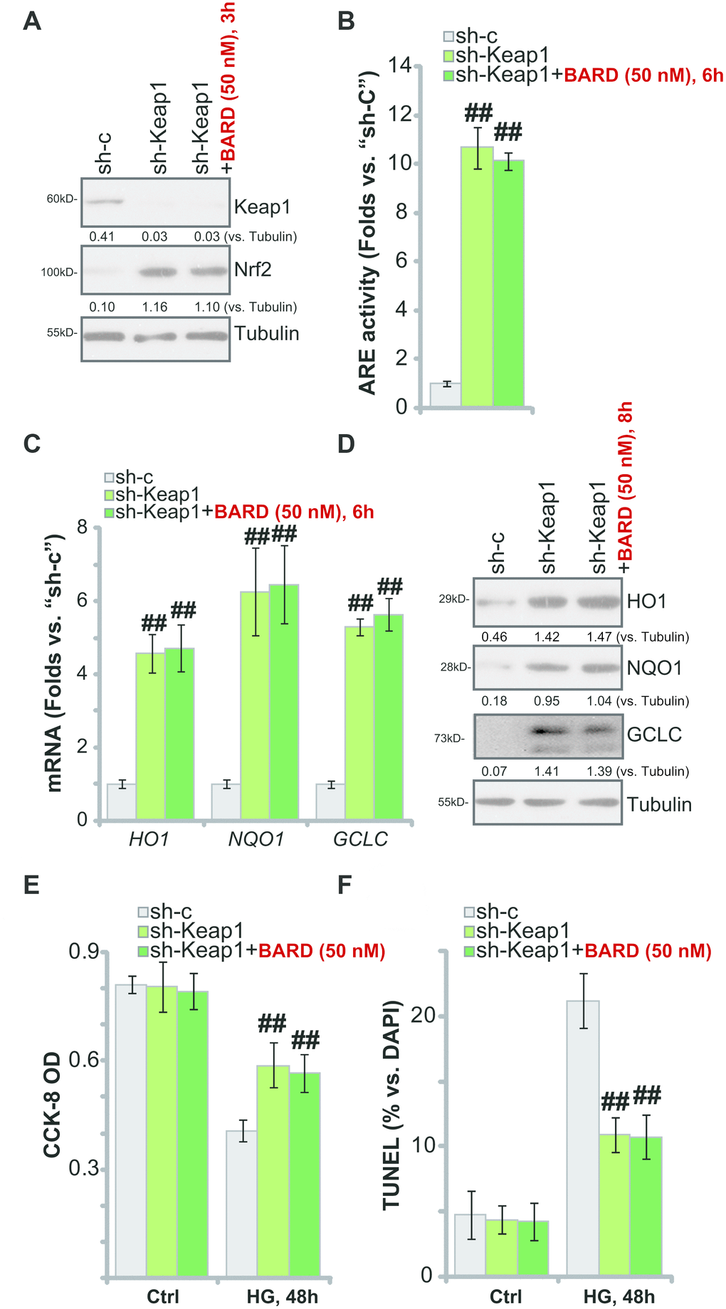 Figure 4. Keap1 silencing mimics BARD-induced cytoprotection in HG-stimulated HUVECs. The stable HUVECs with Keap1 shRNA lentiviral particles (“sh-Keap1”) were treated with or without Bardoxolone Methyl (BARD, at 50 nM) for applied time periods, control cells were transduced with the scramble control shRNA (“sh-C”), expression of listed genes was tested by qPCR and Western blotting analyses (A, C, D), with the relative ARE activity examined as well (B); Alternatively, cells were pretreated with BARD (50 nM) for 1h, followed by HG stimulation and cultured for 48h, cell viability (CCK-8 assay, E) and apoptosis (nuclear TUNEL staining assay, F) were tested. Expression of the listed proteins was quantified, normalizing to the indicated loading control protein (A and D). Error bars stand for mean ± standard deviation (SD, n=5). ##p<0.01. vs. “sh-C” cells. Each experiment was repeated five times to insure the consistency of experimental results.