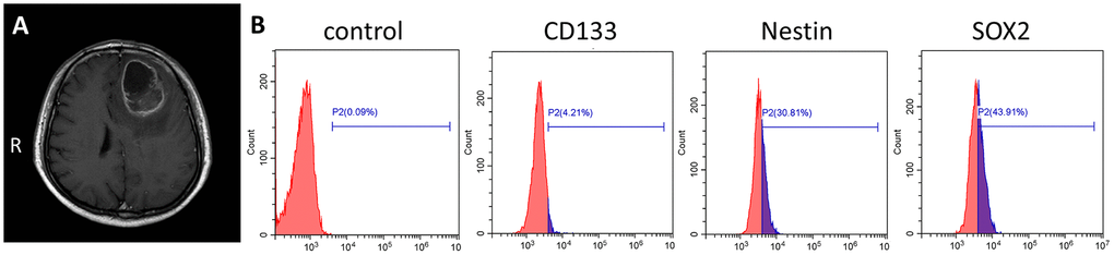 Figure 1. Primary culture of human GSC-SU4s. (A) Enhanced T1 MRI image of a 67-year-old male patient with left frontal mass. (B) Flow cytometric analysis of GSC markers on GSC-SU4 cells.