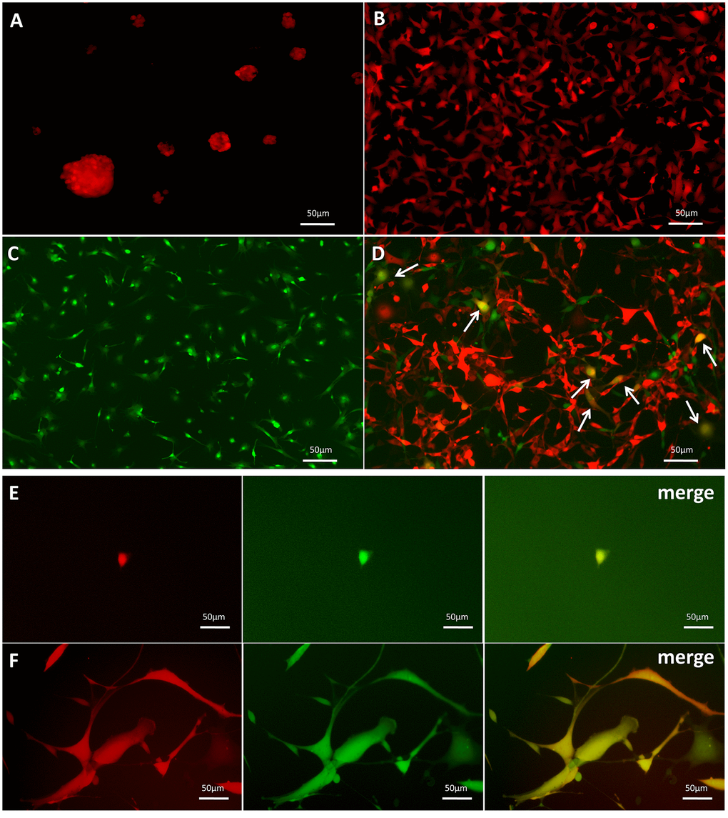 Figure 2. Dual-color fluorescence tracing of co-cultured SU4-RFPs and MSC GFPs, followed by mono-cloning of double-positive fluorescent cells. Stable expression of RFP in SU4 cells exhibiting (A) sphere-like or (B) adherent growth. (C) Expression of GFP in MSCs from GFP-Balb/c athymic nude mice. (D) RFP+/GFP+ cells (arrows) were observed in co-cultures of SU4-RFP and MSC-GFPs. (E) RFP+/GFP+ cells were mono-cloned from the co-cultures system and (F) subcultured.