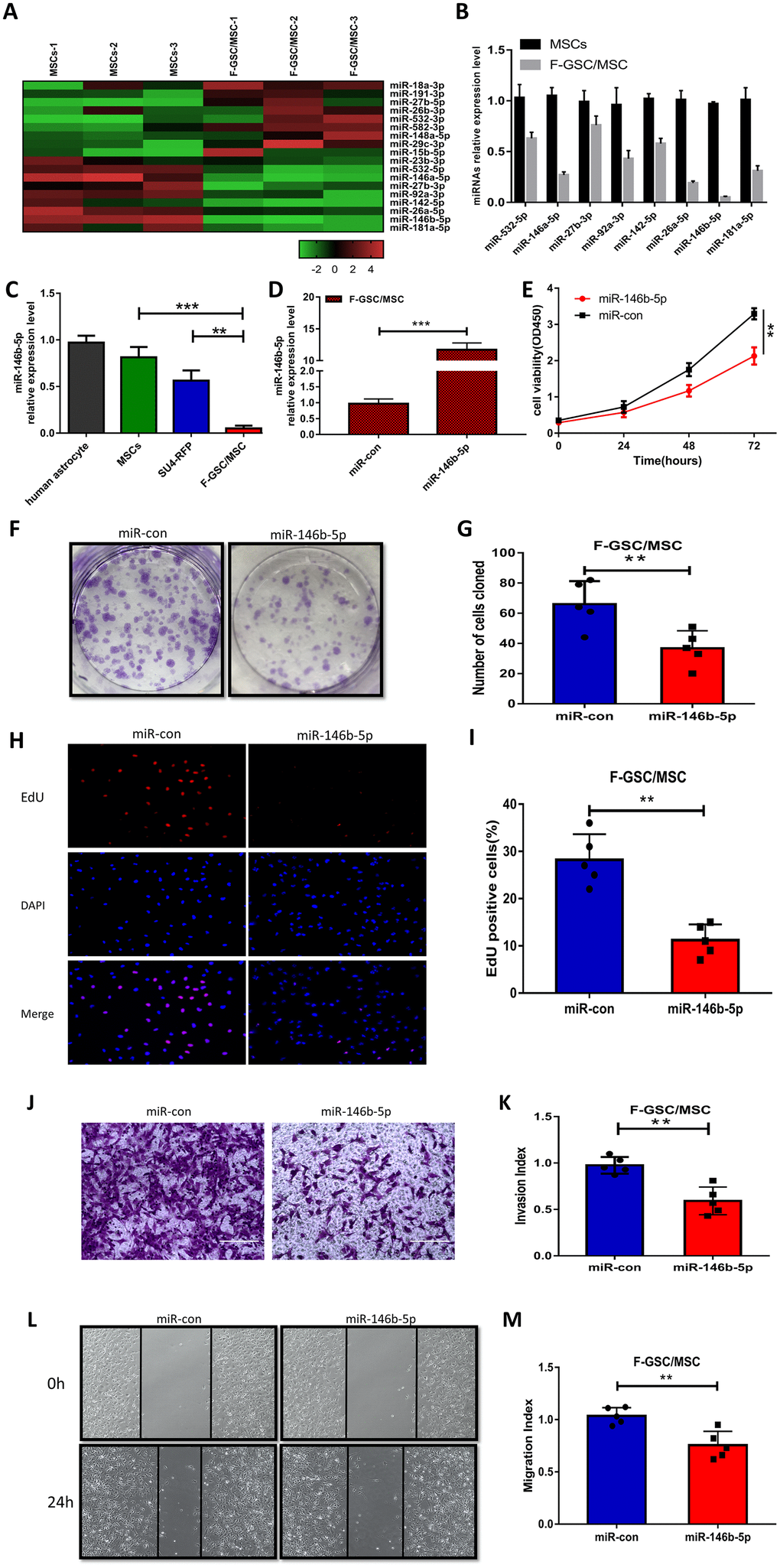 Figure 5. MiR-146b-5p is downregulated in F-GSC/MSCs and its overexpression inhibits F-GSC/MSC proliferation, invasion and migration. (A) Hierarchical clustering demonstrated distinguishable miRNA expression profiles in MSC and F GSC/MSC microarray data. (B) qPCR verified miR-146b-5p expression was the lowest among downregulated miRNAs in F-GSC/MSCs. miR-146b-5p expression in (C) F-GSC/MSs was lower than in MSC-GFPs or SU4-RFPs. (D) miR-146b-5p levels in F-GSC/MSs were upregulated by transfection of miR-146b-5p mimics. (E) Proliferation of F GSC/MSCs transfected with miR-146b-5p mimic or negative control was measured with CCK8 assays. (F and G) Colony formation assays with F GSC/MSCs transfected with miR-146b-5p mimic or negative control. (H and I) Effect of miR-146b-5p upregulation on F-GSC/MSC proliferation was determined using EdU assays. (J and K) Effect of miR-146b-5p upregulation on invasiveness of F GSC/MSCs was determined using Matrigel transwell assays. (L and M) Effect of miR-146b-5p on F-GSC/MSC migration was evaluated in wound-healing assays.
