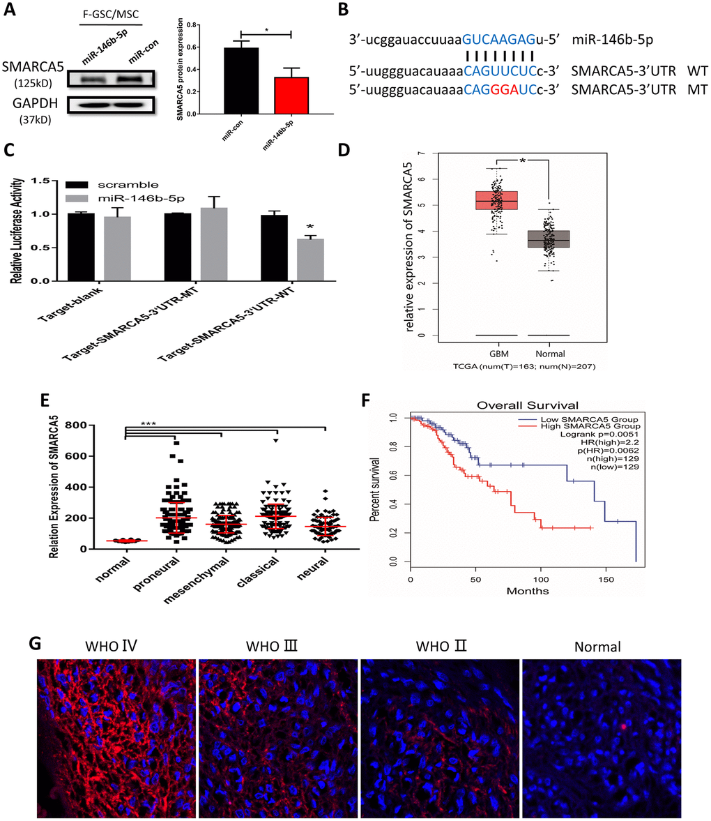 Figure 6. MiR-146b-5p negatively regulates SMARCA5, which is highly expressed in high-grade gliomas. (A) Western blot analysis of SMARCA5 expression in F GSC/MSCs overexpressing miR-146b-5p. (B) Predicted binding site between miR 146b-5p and SMARCA5. Wild type (WT) and mutant (MT) SMARCA5 vectors were constructed for luciferase assays. (C) Luciferase activity indicated miR-146b-5p bound directly to the 3’ UTR of SMARCA5. (D) SMARCA5 expression in glioblastoma and normal tissue from a TCGA dataset. (E) SMARCA5 expression in different glioblastoma subtypes in the TCGA dataset. (F) Overall survival among glioma patients in a low SMARCA5 and high SMARCA5 group. (G) Immunofluorescence analysis of SMARCA5 expression in different WHO grade gliomas.