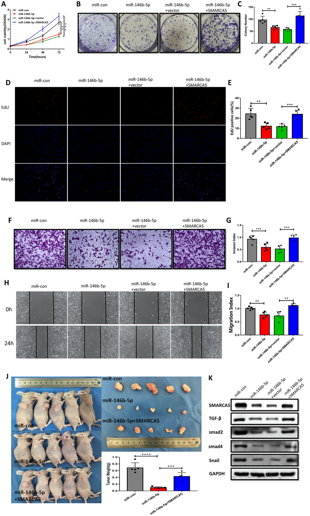 Figure 7. SMARCA5 restoration reverses miR-146b-5p-mediated inhibition of F GSC/MSC proliferation and metastasis. (A) CCK8, (B and C) colony formation, and (D and E) EdU assays were conducted to evaluate F GSC/MSC proliferation after transfection with miR-146b-5p alone or co-transfection with miR-146b-5p plus SMARCA5. (F and G) Transwell assays to assess the invasiveness of F GSC/MSCs transfected with miR-146b-5p alone or with miR-146b-5p plus SMARCA5. (H and I) Wound healing assays to assess migration of F GSC/MSCs transfected with miR 146b 5p alone or with miR-146b-5p plus SMARCA5. (J) Xenograft model for evaluation of tumorigenesis in vivo. (K) Western blot analysis of proteins in the TGF β pathway in F GSC/MSCs transfected with miR-146b-5p alone or with both miR 146b 5p and SMARCA5.