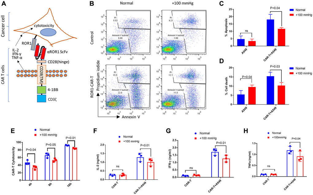 We have been interested in improving CAR T cells for solid cancer treatment. We constructed an αROR1-CAR using the highly specific ScFv of a rabbit anti-human ROR1 monoclonal antibody (mAb) published before [29] (see details in Methods). ROR1 was broadly expressed on many tumor cells, including lung adenocarcinomas cell A549 [30, 31]. αROR1-CAR T cells can be activated by ROR1-ScFv conjugation, releasing cytokines including IL-2, IFN-γ and TNF-α and inducing cytotoxicity in cancer cells (Figure 1A). To evaluate whether pressure would alter the cytotoxicity of αROR1-CAR T cells to A549 cells, we added freshly prepared αROR1-CAR T cells to A549 cells that have been cultured in normal or elevated pressure (+100 mmHg) for 2 passages (~7 days). After 4 hours of co-culture, the αROR1-CAR T cells effectively induced apoptotic cell death in A549 cells (Figure 1B–1D). Importantly, both apoptosis and cell death were reduced by elevated pressure. Elevated pressure did not affect apoptosis of A549 cells alone; instead, it slightly increased the cell death in several experimental repeats (Figure 1D).