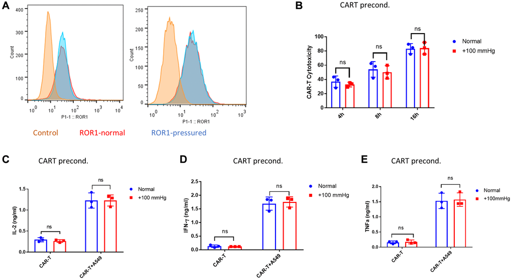 Because both CAR T cells and cancer cells were under elevated pressure in cytotoxicity assay, the reduced cytotoxicity could be attributed to either αROR1-CAR T, A549, or both. We first tested if preconditioning of αROR1-CAR T cells under elevated pressure (+100 mmHg) for 24 hours could result in reduced cytotoxicity. We verified that the αROR1-CAR expression on T cell surface was not changed by 24 hours of pressurized culture (Figure 2A). We then preconditioned αROR1-CAR T cells with +100 mmHg for 24 hours and co-cultured with A549-Red-Fluc cells under normal conditions for 16 hours. Interestingly, 24-hour pressure preconditioning did not significantly alter CAR-T cytotoxicity (Figure 2B). Cytokines in the co-culture medium were evaluated by enzyme-linked immunosorbent assay (ELISA). Consistent with cytotoxicity assay, IL-2, IFN-γ, and TNF-α were not changed by pressure preconditioning of αROR1-CAR T cells (Figure 2C–2E).
