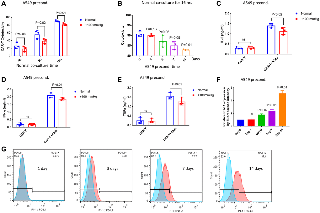 We next asked if A549 cells could become more resistant to CAR-T cells under elevated pressure. To mimic chronic pressure in solid tumors, we have maintained A549 cells in +100 mmHg for at least 2 passages (~7 days). We pressure-preconditioned A549 cells for 7 days but co-cultured with non-pressurized αROR1-CAR T cells for 4, 8, and 16 hours. Indeed, pressure preconditioning of A549 cells slightly increased the resistance to αROR1-CAR T cell cytotoxicity (Figure 3A). To further confirm this result, we cultured A549 cells under +100 mmHg pressure for 1, 3, 7, 14 days and examined the cytotoxicity after incubating with CAR-T cells for 16 hours. We found a time-dependent resistance of A549 cells to CAR-T cytotoxicity (Figure 3B). 14-day and 7-day preconditioning caused significant resistance to αROR1-CAR T cell; 3-day preconditioning followed the same trend (P = 0.06); 1-day preconditioning showed no discernible effect. Consistently, the cytokine release experiment by ELISA confirmed that pressure-preconditioning over 7 days suppressed the release of IL-2, IFN-γ, and TNF-α (Figure 3C–3E).