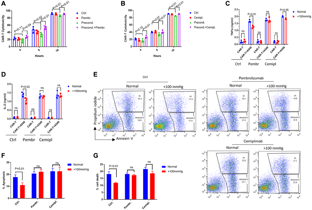 We asked if the increased expression of PD-L1/PD-L2 in A549 cells under elevated pressure could contribute to the decrease in CAR-T cell-mediated cytotoxicity. PD-L1/PD-L2 inhibits T cell cytotoxicity by interacting with PD-1 on T cell surface. The recent FDA-approved antibody drugs pembrolizumab and Cemiplimab block such interaction, increase cancer antigen recognition, therefore contribute to cancer eradication. We tested if these antibodies could also mitigate the pressure-induced resistance to CAR-T cell treatment. By adding Pembrolizumab (10 μg/ml) or Cemiplimab (10 μg/ml) directly into the co-cultured αROR1-CAR T and A549 cells, we found that the pressure-induced resistance was largely blocked (Figure 4A–4B). Consistently, the secretion of cytokines IFN-γ and TNF-α was largely rescued to the levels under normal conditions (Figure 4C–4D). In addition, the apoptotic cell death in pressure-preconditioned A549 cells was also robustly increased (Figure 4E–4G). Together, our data suggest that PD-L1 antibodies could enhance CAR-T-mediated cytotoxicity in solid tumors.