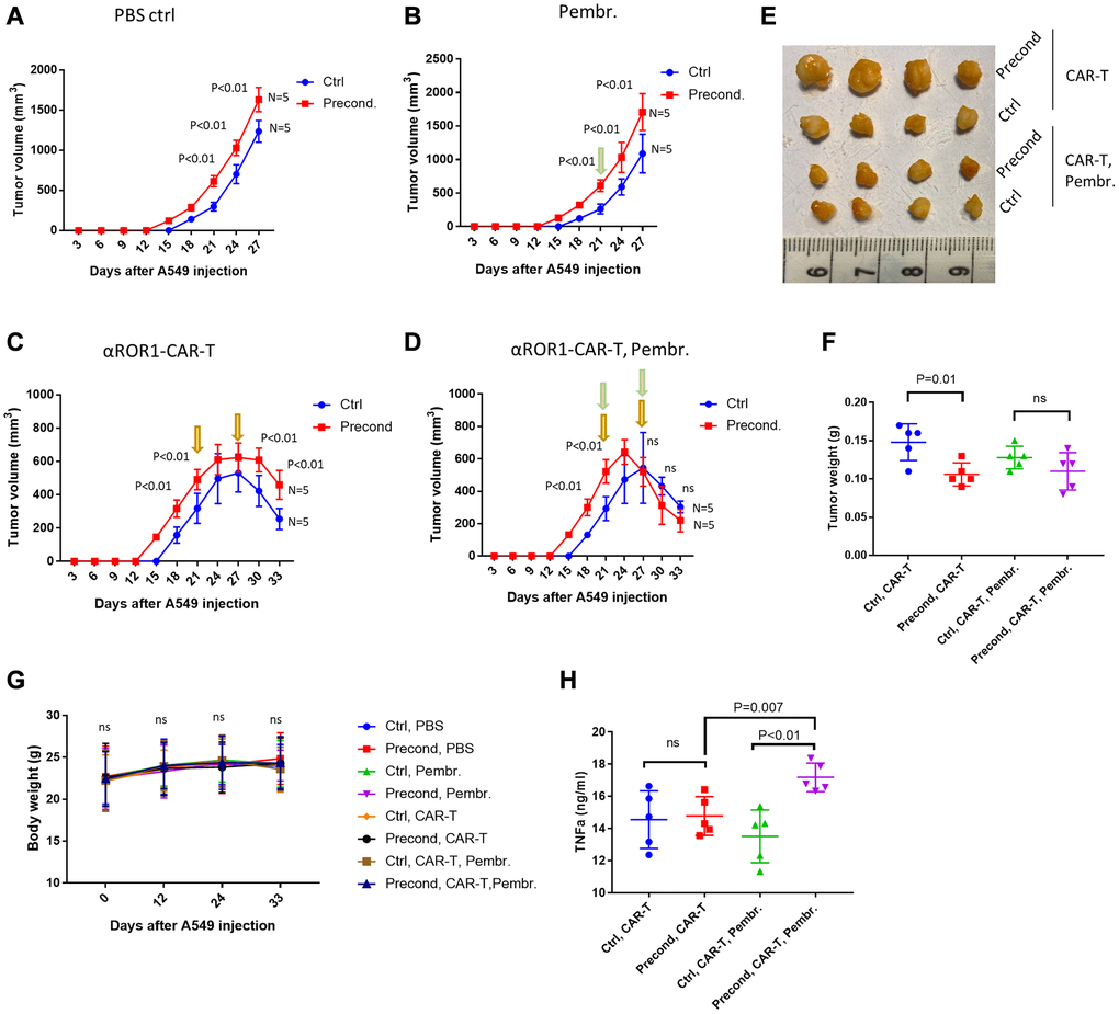 To further confirm our in vitro study, we established xenograft tumors in male BALB/c athymic nude mice by injecting A549 cells subcutaneously. We followed the growth of the tumors and found that, interestingly, pressure-preconditioned A549 cells formed tumors faster than normal A549 cells, resulting in larger tumor size at the same time following injection (Figure 5A). Larger tumor size was observed regardless of treatment with PD-L1 antibody pembrolizumab or αROR1-CAR T cells (Figure 5B–5C). However, when treated with pembrolizumab and αROR1-CAR T cells in combination, the larger size of pressure-preconditioned A549 tumors was shrinking faster, resulting in no difference after 6 days of treatment (Figure 5D–5F). All treatments, including pembrolizumab, αROR1-CAR T cells, or in combination did not change the weight of mice, nor did they change the appearance and mobility of the mice, suggesting a specific effect of the combined therapy (Figure 5G). Consistently, the plasma TNFα levels were increased specifically by combined therapy of pembrolizumab and αROR1-CAR T cells, but not by individual treatments (Figure 5H). These results confirmed our in vitro study and suggested that PD-L1 checkpoint inhibitors could enhance CAR T cells cytotoxicity in solid tumors.