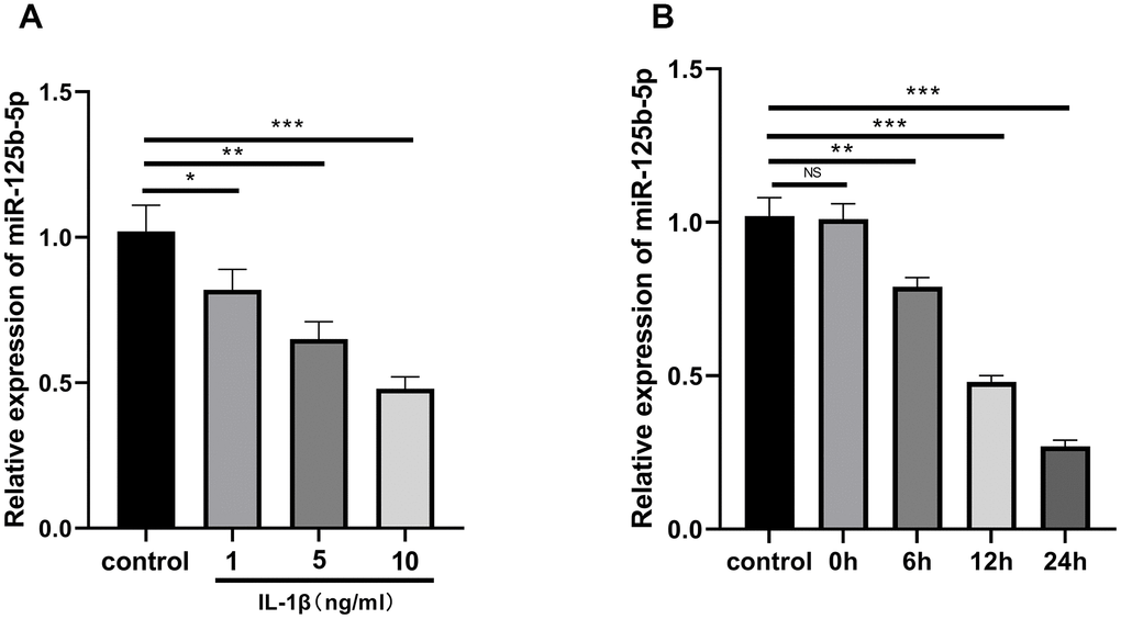 Figure 1. miR-125b-5p was downregulated in IL-1β-mediated OA. IL-1β (1, 5, 10 ng/mL) was employed to treat ATDC5 cells for 0, 6, 12, and 24 h, respectively. (A) qRT-PCR was conducted to determine the miR-125b-5p expression under the IL-1β (1, 5, 10 ng/mL) treatment. (B) miR-125b-5p was measured by qRT-PCR at 0, 6, 12, 24 h after IL-1β (10 ng/mL) treatment. *P<0.05, **P<0.01, ***P<0.001 (VS. the control group), N=3.