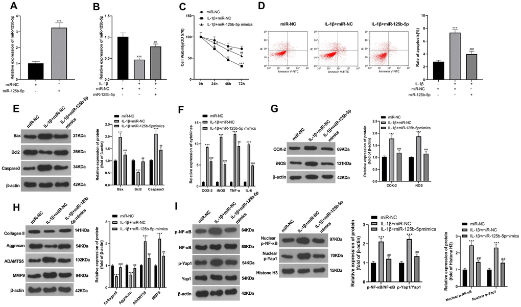 Figure 2. Overexpressing miR-125b-5p eased IL-1β-induced chondrocyte injury. miR-125b-5p mimics were transfected into IL-1β (10 ng/mL)-induced ATDC5 cells to construct a miR-125b-5p overexpression model. (A, B) qRT-PCR was utilized to test the miR-125b-5p profile. (C) MTT assay was adopted to determine cell viability. (D) Flow cytometry was applied to detect cell apoptosis. (E) WB was implemented to compare the expression of Bax, Bcl2, and Caspase3. (F) qRT-PCR was adopted to determine the expression of COX-2, iNOS, TNF-α and IL-6 in ATDC5 cells. (G–I) WB was employed to measure the expression of inflammatory mediators (COX-2 and iNOS), ECM (Collagen II, Aggrecan, ADAMTS5, and MMP9), and YAP1/NF-κB in ATDC5 cells. *P<0.05, **P<0.01, ***P<0.001, #P<0.05, ##P<0.01, ###P<0.001, N=3.