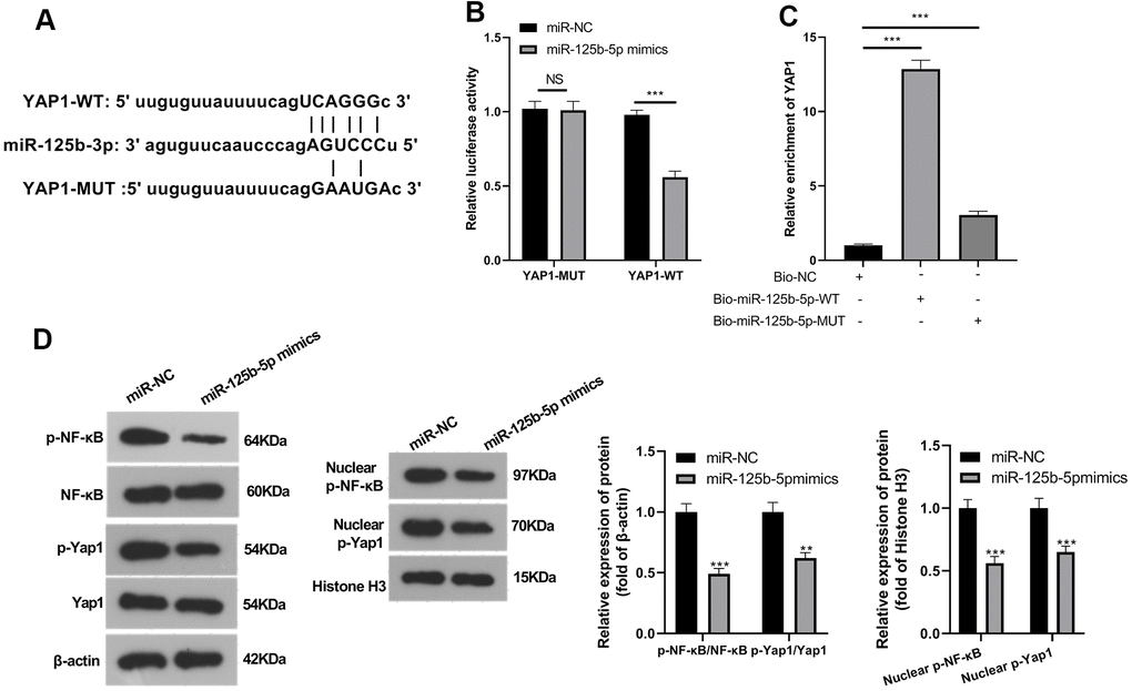 Figure 3. miR-125b-5p targeted YAP1. (A) The bioinformatics database Starbase was adopted to find out the potential target of miR-125b-5p. (B, C) Dual-luciferase reporter assay and RNA pull-down assay were employed to certain the targeted relationship between miR-125b-5p and YAP1. (D) WB was employed to define the YAP1/NF-κB level in ATDC5 cells transfected with miR-NC or miR-125b-5p mimics. NS P > 0.05, *** P < 0.001 (vs. miR-NC), *** P < 0.001 (vs Bio-NC group), N = 3.