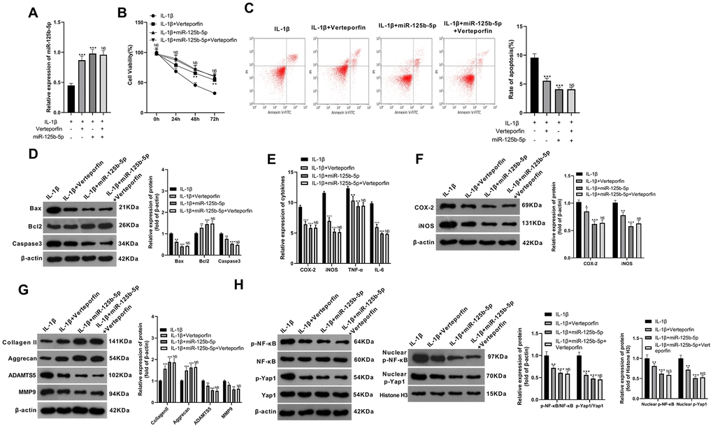 Figure 4. Overexpressing miR-125b-5p played anti-inflammatory and anti-apoptotic roles by inhibiting the YAP1/NF-κB signaling pathway, thus alleviating OA. miR-125b-5p mimics were transfected into IL-1β (10 ng/mL)-induced ATDC5 cells, with 2 μg/mL Verteporfin treatment. (A) The miR-125b-5p expression was tested by qRT-PCR. (B) Cell viability was monitored by MTT assay. (C) Flow cytometry was conducted to monitor cell apoptosis. (D) WB was applied to determine the expression of Bax, Bcl2, and Caspase3. (E) The expression of COX-2, iNOS, TNF-α, and IL-6 was verified by qRT-PCR. (F–H) WB was implemented to examine the profiles of COX-2, iNOS, ECM-related markers (Collagen II, Aggrecan, ADAMTS5, and MMP9), and YAP1/NF-κB in ATDC5 cells.. *P<0.05, **P<0.01, ***P<0.001 (vs. IL-1β group), NS P>0.05 (vs. the IL-1β+miR-125b-5p group), N=3.