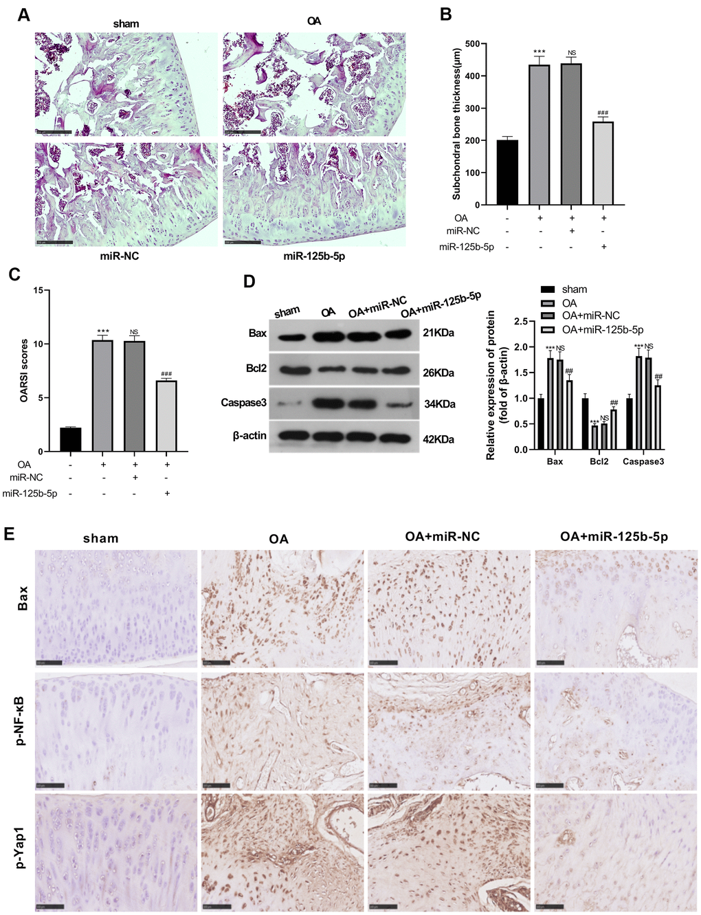 Figure 5. Overexpressing miR-125b-5p alleviated OA development in rats. The OA rat model was constructed by destabilization of the medial meniscus (DMM). The knee tissues of OA rats were transfected with miR-NC as the control and further transfected with miR-125b-5p mimics. (A) Safranin O staining and toluidine blue staining were carried out to observe morphological differences of the rat knee sections. (B) The thickness (μM) of the subchondral bone plate. (C) OARSI score. (D) WB detected the expression of apoptotic proteins Bax, Bcl2 and Caspase3 in the knee tissues. (E) The expression of Bax, p-YAP1 and p-NF-κB was compared by IHC. ***P<0.001 (vs. sham group), NS P>0.05 (vs. OA group), ##P<0.01, ###P<0.001(vs. OA+miR-NC group). N=5.