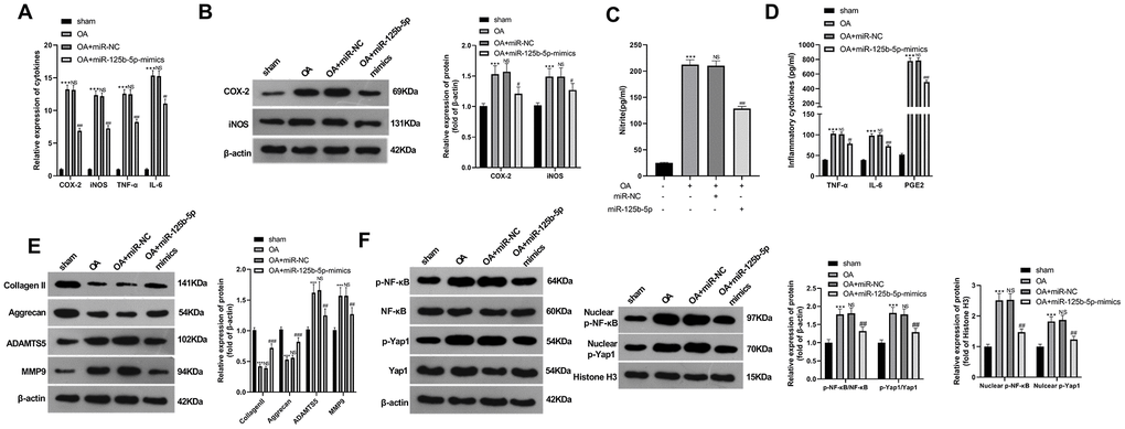 Figure 6. Overexpressing miR-125b-5p alleviated the inflammatory response in OA rats. The OA rat model was constructed by destabilization of the medial meniscus (DMM). The knee tissues of OA rats were transfected with miR-NC as the control and further transfected with miR-125b-5p mimics. (A) qRT-PCR was utilized to compare the expression of COX-2, iNOS, TNF-α, and IL-6 in the knee tissues. (B) WB was employed to check the expression of COX-2 and iNOS in the knee tissues. (C) The Griess reaction method was employed to determine the NO content in each group in the knee tissues. (D) The concentration of TNF-α, IL-6 and PGE2 was calculated by ELISA in the knee tissues. (E, F) The protein expression of Collagen II, Aggrecan, ADAMTS5, MMP9, and YAP1/NF-κB in the knee tissues was compared by WB. ***P<0.001, NS P>0.05 (vs. OA group), ##P<0.01, ###P<0.001 vs. OA+miR-NC group, N=5.