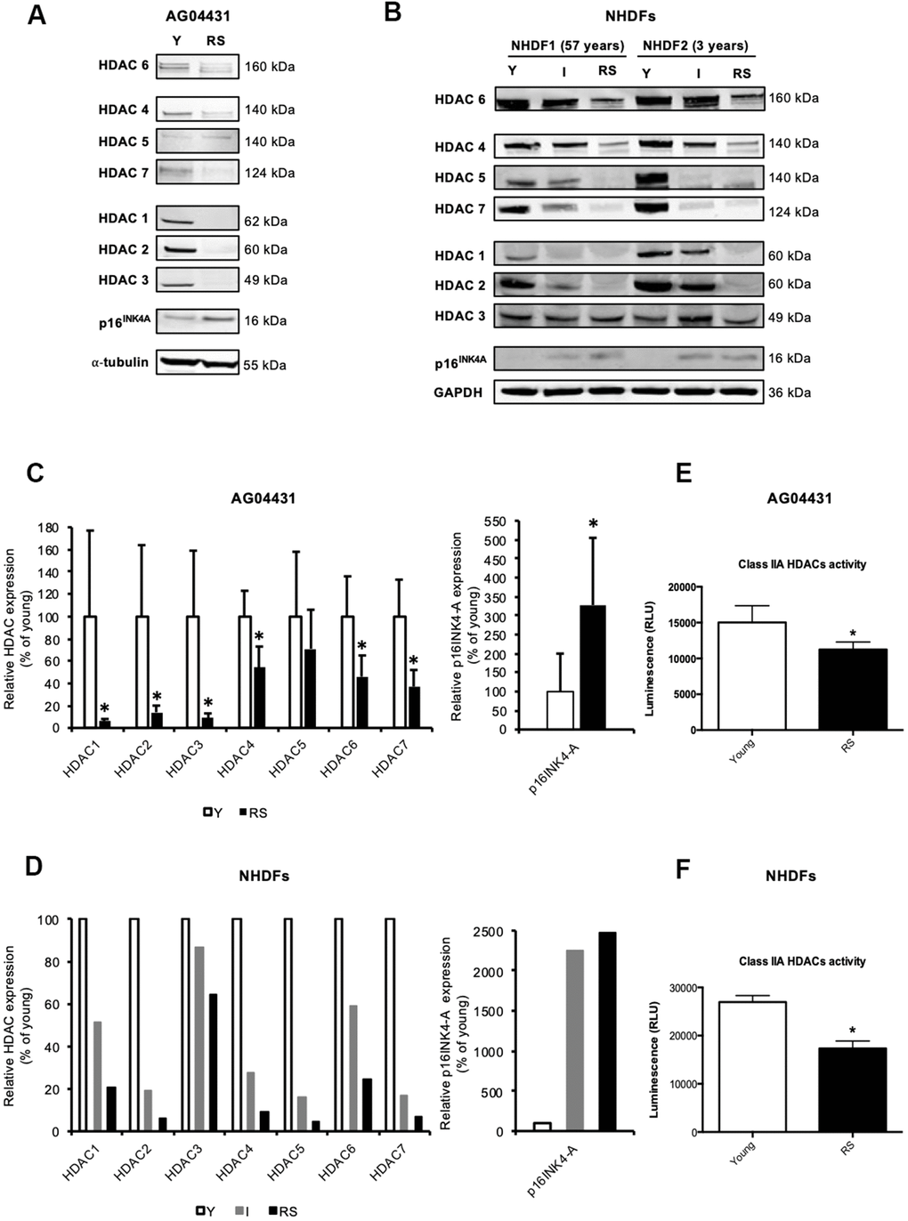 Figure 1. Reduced expression of HDACs expression in replicative senescence. (A, B) Representative Western blots showing HDACs 1-7 and p16INK-4A protein level in young (early passage, Y), intermediate (I) or replicative senescent (RS) AG04431 cells (A) or primary normal human dermal fibroblasts (NHDFs) isolated from an adult donor (57 years) or a young donor (3 years) (B). (C, D) Quantifications of the protein level of HDACs 1-7 and p16 INK-4A, with α-tubulin (AG04431, n=4) or GAPDH (NHDFs, n=2) as loading control. (E, F) Class IIa HDACs activity in AG04431 (e) (n=3) or in NHDFs (F) (n=3). Statistical analyses were performed using a t-test (*: p<0.05).