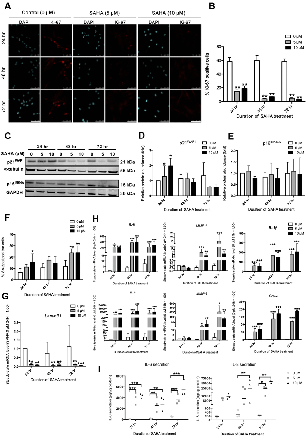 Figure 2. SAHA repeated treatment induces the appearance of senescence biomarkers in AG04431 cells. Cells at early passage were treated with 0, 5 or 10 μM of SAHA during 24, 48 or 72 hr. (A) Representative confocal images of cells labelled with Ki-67 staining (red) and DAPI (nucleus staining, blue) (scale bar = 50 μM). (B) Percentage of Ki-67-positive cells. (C) Representative Western blots showing p16INK-4a and p21WAF-1 protein level, with α-tubulin or GAPDH as loading control. (D, E) Quantifications of the relative protein level of p21WAF-1 (D) and p16INK-4a (E). Signal intensities were quantified and normalized according to the abundance of α-tubulin or GAPDH and were expressed relatively to the control condition (0 μM SAHA, 24 hr). (F) Percentage of SA-βgal positive cells. (G) Steady-state mRNA level of Lamin B1. GAPDH was used as a housekeeping gene. (H) Steady-state mRNA level of IL-6, IL-8, MMP-1, MMP-3, IL-1β and Gro-α. GAPDH was used as housekeeping gene. Results are normalized to the control condition (0 μM SAHA, 24 hr). (I) Secretion of IL-6 and IL-8 following SAHA treatment. Supernatants were collected at 24, 48 and 72 hr and the IL-6 and IL-8 secreted levels were monitored by ELISA. Statistical analyses were performed using an ANOVA II (*: p<0.05; **: p<0.01; ***: p<0.001).