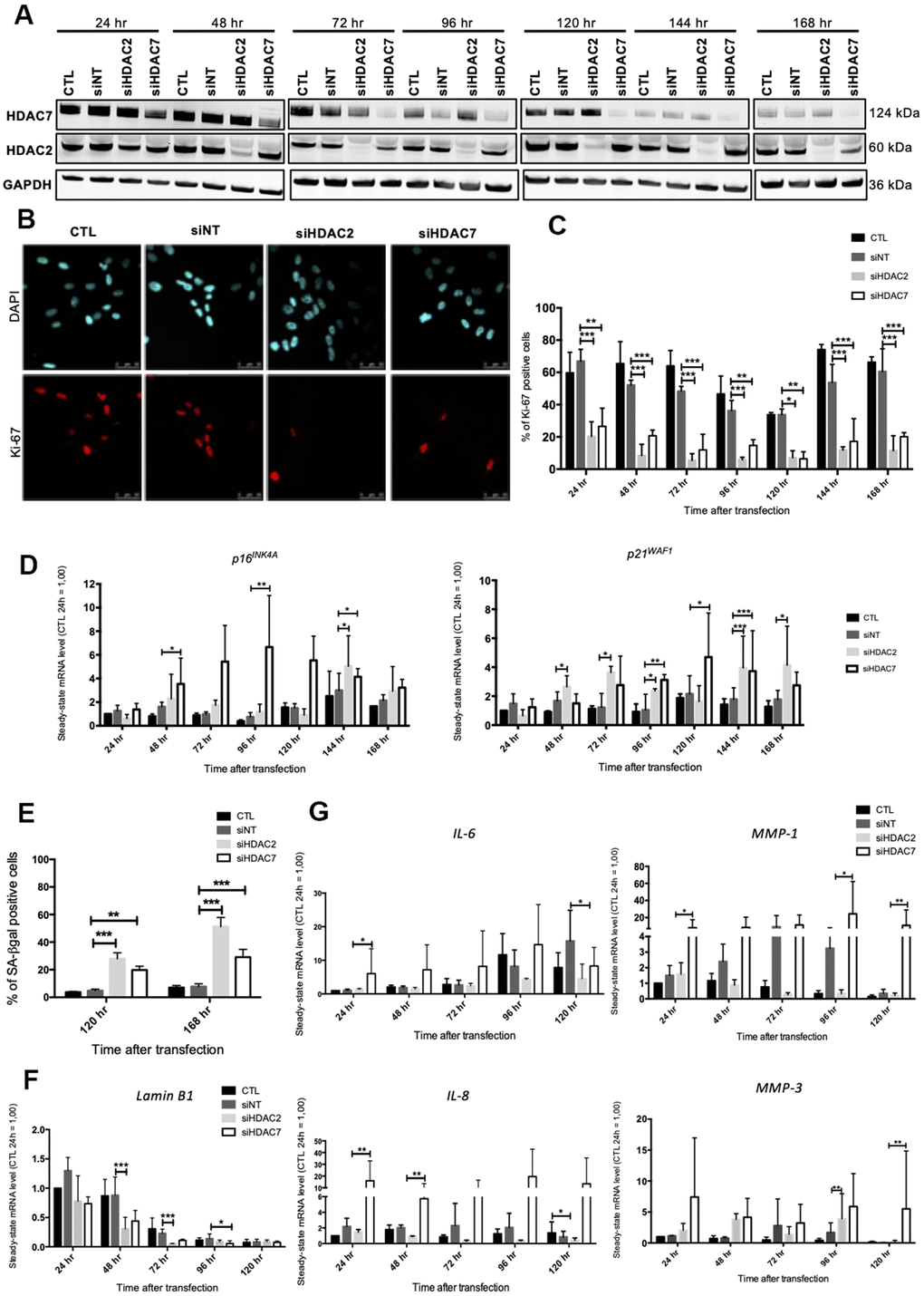The impact of HDAC2 or HDAC7 invalidation on proliferation was then tested. Results demonstrated that HDAC2 and HDAC7 invalidation strongly reduced the proportion of Ki-67 positive cells, starting 24 hr after transfection (Figure 3B, 3C). This decrease in proliferation was correlated to an increase in the mRNA level of p16INK4-A and p21WAF-1 from 48 hr to 168 hr post-transfection (Figure 3D). At the protein level, results displayed a significant increase in the protein abundance of p16INK4-A at 120 hr post-transfection for siHDAC7, as well as a tendency for an increase in protein expression of p21WAF-1, for both HDACs siRNA, at 144 hr (Supplementary Figure 6). The proportion of SA-βgal positive cells following HDAC2 and HDAC7 invalidation showed a significant increase in both siHDAC2 and siHDAC7 transfected cells, compared to cells transfected with the non-targeting siRNA (siNT) at 120 hr and 168 hr post transfection (Figure 3E). The transcript levels of LMNB1 was then studied and results demonstrated a decrease in LMNB1 transcript levels at 48 hr and 72 hr in HDFs transfected with siHDAC2 and at 96 hr in HDFs transfected with siHDAC7 (Figure 3F). The effect of siHDAC2 or siHDAC7 transfection on the expression of several SASP factors displayed different results between the two siRNAs. HDFs transfected with siHDAC7 overexpressed significantly IL-6, IL-8, MMP-1 and MMP-3 at some time points (Figure 3G). Conversely, transfection of HDFs with siHDAC2 showed minor effects on the expression of these SASP factors, as only a significant increase in the expression of MMP-3 was detected at 96 hr post-transfection (Figure 3G).