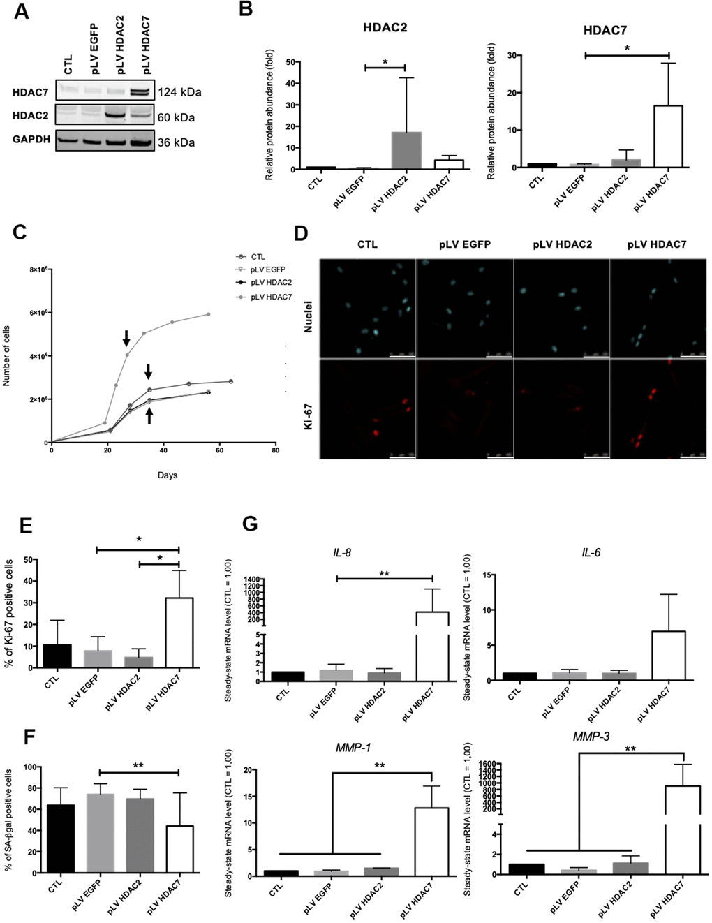 Figure 4. HDAC7 but not HDAC2 re-expression allows to resume proliferation in pre-senescent cells. Pre-senescent AG04431 HDFs, i.e. cells at few passages from the onset of replicative senescence, were transduced with lentiviruses expressing EGFP (pLV EGFP), HDAC2 (pLV HDAC2) or HDAC7 (pLV HDAC7). (A) Representative Western blots showing HDAC2 and HDAC7 expression after transduction. GAPDH was used as a loading control. (B) Quantification of the relative protein abundance of HDAC2 and HDAC7. Signal intensities were quantified and normalized relative to the abundance of GAPDH and are expressed relatively to the control condition (CTL). (C) Representative growth curves of the cells with indicated conditions. The passages studied are indicated by an arrow. (D) Representative confocal images of cells labelled with Ki-67 staining (red) and DAPI (nucleus staining, blue) (scale bar = 50 μM). (E) Percentage of Ki-67-positive cells. (F) Percentage of SA-βgal positive cells. (G) Steady-state mRNA level of IL-6, IL-8, MMP-1 and MMP-3. GAPDH was used as housekeeping gene. Results were expressed as fold induction in comparison with the control condition. Statistical analyses were performed using an ANOVA I (*: p<0.05; **: p<0.01).