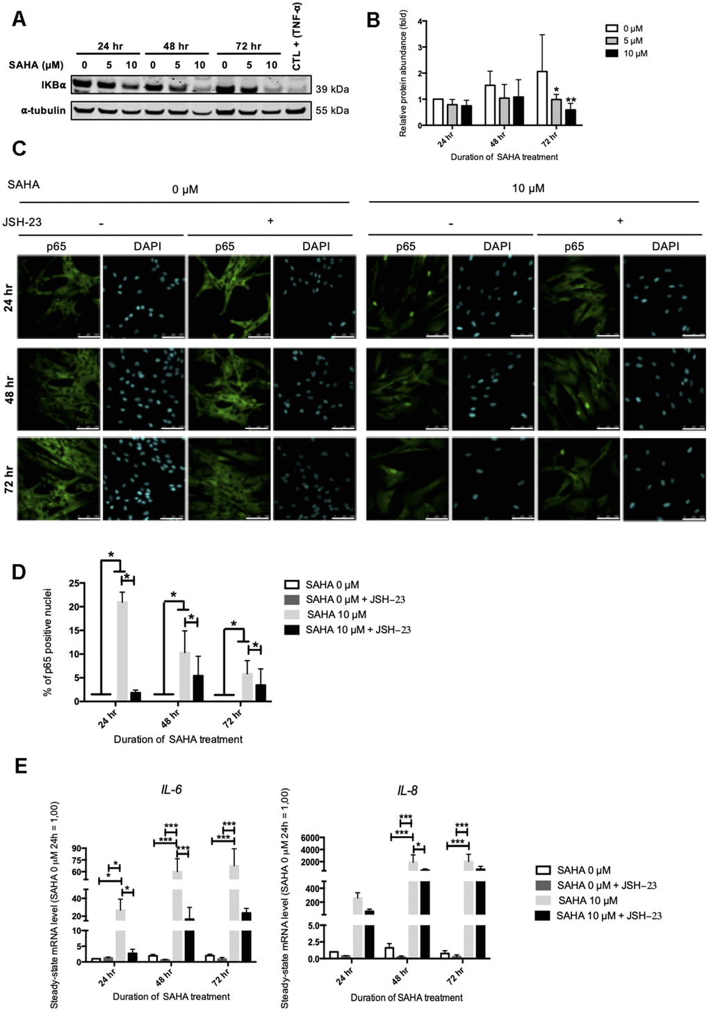 Figure 5. IL-6 and IL-8 expression observed after SAHA treatment is partly dependent on NF-κB activation. Cells at early passage were treated with 0, 5 or 10 μM of SAHA during 24, 48 or 72 hr in combination or not with JSH-23 treatment (NF-κB inhibitor) during 24 hr. (A) Representative Western blots showing IĸBα total protein abundance after SAHA treatment. AG04431 dermal fibroblasts treated with 20 ng/mL of TNF-α during 20 minutes were used as positive control for IĸBα degradation. α-tubulin was used as loading control. (B) Quantification of the relative protein abundance of IĸBα. Signal intensities were quantified and normalized relative to the abundance of α-tubulin and are expressed relative to the control condition (0 μM SAHA, 24 hr). (C) Immunofluorescence analysis of p65 (green) nuclear translocation. Nuclei were labelled with DAPI (blue). Cells were visualized with confocal microscopy (scale bar = 50 μM). (D) Quantification of the percentage of p65 positive nuclei. (E) Steady-state mRNA level of IL-6 and IL-8. GAPDH was used as housekeeping gene. Results are expressed as fold induction in comparison with control fibroblasts (0 μM SAHA, 24 hr). Statistical analyses were performed using an ANOVA II (*: p<0.05; **: p<0.01; ***: p<0.001).