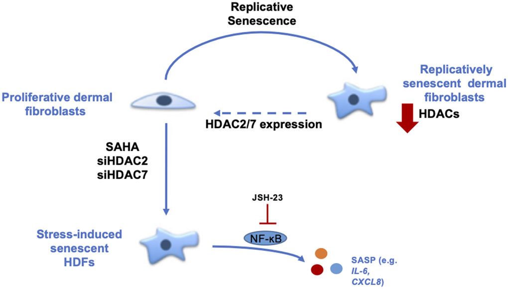 Our results pointed out that HDACs inhibition in AG04431 dermal fibroblasts, either with SAHA or with siRNA targeting HDAC2 or HDAC7 induced a strong overexpression of some SASP factors, such as IL-6, IL-8, MMP-1 and MMP-3. SASP regulation and particularly IL-6 and IL-8 expression, is largely dependent on NF-κB (nuclear factor-kappa B) activation [11].