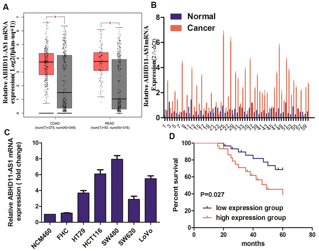 Figure 1. ABHD11-AS1 was highly expressed in CRC and indicated a poor prognosis. (A) Public database GEPIA displayed the mRNA expression of ABHD11-AS1 in CRC and normal colorectal tissue. (B) mRNA expression of ABHD11-AS1 in CRC and normal colorectal tissue in our patient samples. (C) mRNA expression ABHD11-AS1 in CRC and normal colonic epithelium cell line. (D) Kaplan–Meier plot of 60 patients with survival data (from our samples) stratified by ABHD11-AS1 expression levels.