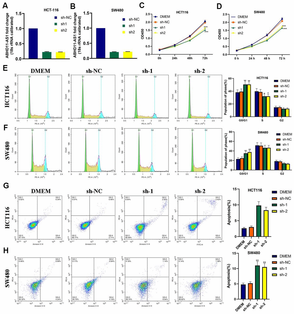 Figure 2. ABHD11-AS1 deficiency attenuated proliferation and promoted apoptosis in CRC cells. (A) ABHD11-AS1 expression in HCT116-ABHD11-AS1-sh cells was determined by RT-qPCR. (B) ABHD11-AS1 expression in SW480-ABHD11-AS1-sh cells was determined by RT-qPCR. (C) The proliferation curves of HCT116-sh-NC cells and HCT116-ABHD11-AS1-sh cells measured by CCK-8 array. (D) The proliferation curves of SW480-sh-NC cells and SW480-ABHD11-AS1-sh cells measured by CCK-8 array. (E) PI staining illustrated the cell cycle distribution of HCT116-sh-NC cells and HCT116-ABHD11-AS1-sh cells. (F) PI staining illustrated the cell cycle distribution of SW480-sh-NC cells and SW480-ABHD11-AS1-sh cells. (G) Annexin V-7ADD and PI double staining illustrated the apoptosis cells of HCT116-sh-NC cells and HCT116-ABHD11-AS1-sh cells. (H) Annexin V-7ADD and PI double staining illustrated the apoptosis cells of SW480-sh-NC cells and SW480-ABHD11-AS1-sh cells. *P<0.05, **P<0.01, ***P<0.001.