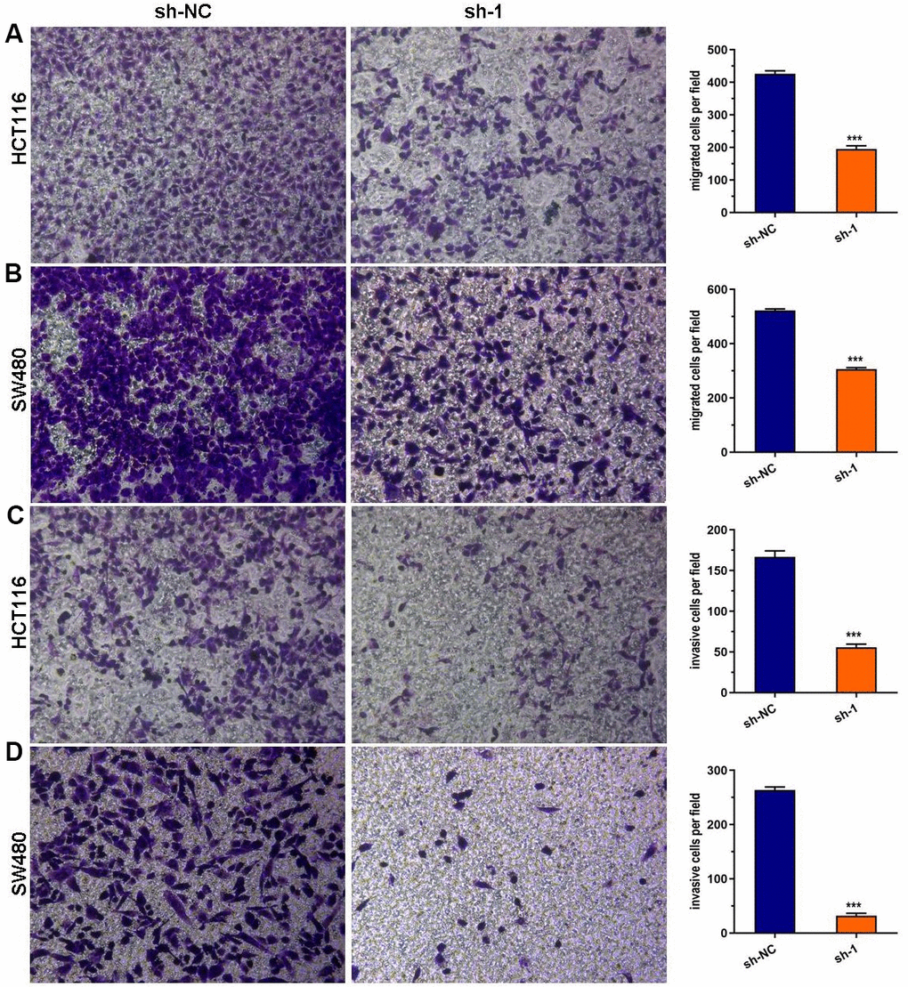Figure 3. ABHD11-AS1 deficiency suppressed CRC cell migration and invasion. (A) Transwell assay for cell migration. The ABHD11-AS1-deficiency HCT116 cell had significantly less migration cells than that of control. (B) Transwell assay for cell migration. The ABHD11-AS1-deficiency SW480 cell had significantly less migration cells than that of control. (C) Transwell assay for cell invasion. The ABHD11-AS1-deficiency HCT116 cell had significantly less invasion cells than that of control. (D) Transwell assay for cell invasion. The ABHD11-AS1-deficiency SW480 cell had significantly less invasion cells than that of control. ***P<0.001.