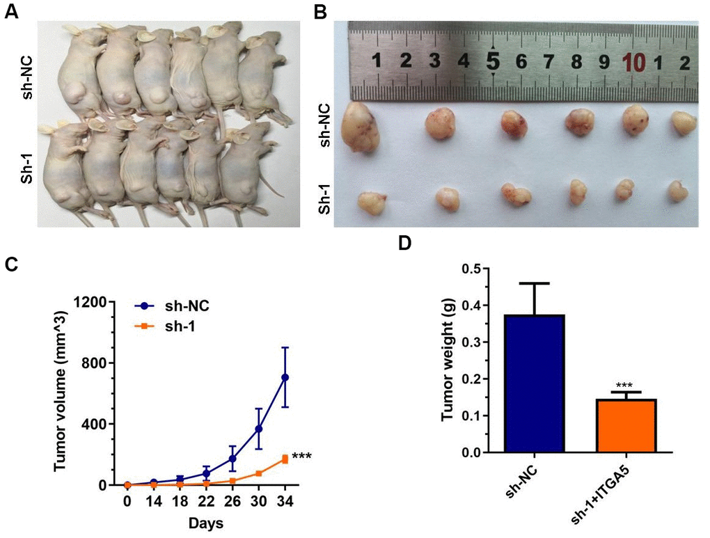 Figure 4. ABHD11-AS1 deficiency impaired CRC cells growth in vivo. (A) Gross view of the tumor bearing in the mice. (B) Gross view of after sampling. (C) Growth curve of tumor volume. (D) Tumor weight was significantly different between the control and ABHD11-AS1 deficiency groups. ***P<0.001.
