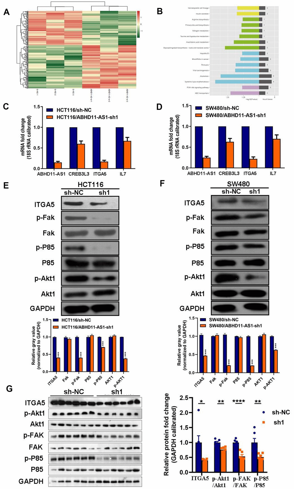 Figure 5. ABHD11-AS1 deficiency inhibited ITGA5/Fak/PI3K/Akt signaling pathway in CRC. (A) mRNA sequencing to find differential genes between HCT116-sh-NC cells and ABHD11-AS1 deficient cells and displayed via Heat-map. (B) Differential genes enriched by KEGG pathway. Top 16 pathways were illustrated. (C) RT-qPCR to detect mRNA expression of ITGA5, CREB3L3, ITGA5, IL7 in HCT116 cells and ABHD11-AS1 deficient cells. (D) RT-qPCR to detect mRNA expression of ITGA5, CREB3L3, ITGA5, IL7 in SW480 cells and SW480 ABHD11-AS1 deficient cells. (E) WB analysis of protein abundance of ITGA5, FAK, p-FAK, P85, p-P85, Akt1, p-Akt1 in HCT116 cells and HCT116 ABHD11-AS1 deficient cells. (F) WB analysis of protein abundance of ITGA5, FAK, p-FAK, P85, p-P85, Akt1, p-Akt1 in SW480 cells and SW480 ABHD11-AS1 deficient cells. (G) WB analysis of protein abundance of ITGA5, FAK, p-FAK, P85, p-P85, Akt1, p-Akt1 in tumor tissues of nude mice. ***P<0.001.