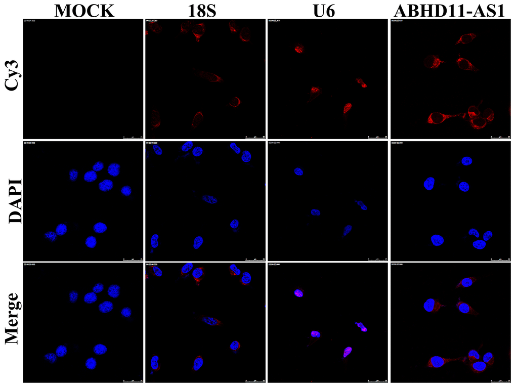 Figure 6. ABHD11-AS1 was mainly localized in the cytoplasm. Subcellular localization of ABHD11-AS1 determined by RNA FISH assay, U6 and 18s rRNA were used as internal controls.