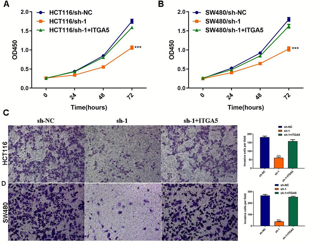 Figure 7. ITGA5 was able to rescue the effects of ABHD11-AS1 deficiency in CRC. (A) The proliferation curve of HCT116 cells with indicated administrations measured by CCK-8 assay. (B) The proliferation curve of SW480 cells with indicated administrations measured by CCK-8 assay. (C) Transwell assay to analysis invasion of HCT116 cell with indicated administrations. (D) Transwell assay to analysis invasion of SW480 cell with indicated administrations. ***P<0.001.