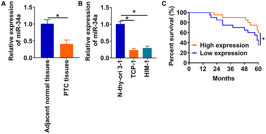 To evaluate the effects of miR-34a in PTC, we firstly detected miR-34a expression in PTC clinical tissues and cell lines. As shown in Figure 1A, the mRNA level of miR-34a was decreased in PTC tissues comparing with adjacent normal tissues. In addition, we examined miR-34a expression in PTC cell lines. Compared with normal thyroid gland cells Nthy-ori 3-1, miR-34a expressions in PTC cell lines HIM-1 and TCP-1 were remarkably reduced (Figure 1B). Then, we analyzed the 60-months survival rate of PTC patients. According to the average expression of miR-34a in 1A, the 40 PTC patients were divided into low and high miR-34a expression groups. The patients with low miR-34a expression had a lower survival rate (Figure 1C). These data suggested a potential regulatory role of miR-34a in the pathological process of PTC.