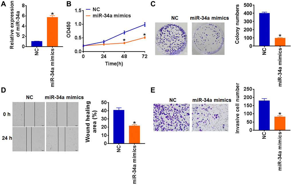 Figure 2. Upregulation of miR-34a inhibits proliferation, migration and invasion in TCP-1 cells. miR-34a mimics and its negative control (NC) was transfected into TCP-1 cells. (A) The expression of miR-34a was determined by qRT-PCR (*p < 0.05). (B) CKK-8 assay was used to examine the cell growth at 0, 24, 48 and 72 h (*p < 0.05). (C) Colony formation assay was used to calculated cell proliferation (*p < 0.05). (D) Wound healing assay was used to detect cell migration (*p < 0.05). (E) Transwell assay was performed to check cell invasive ability (*p < 0.05).