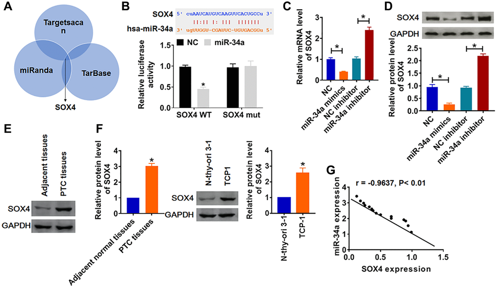 Figure 3. SOX4 was a direct target of miR-34a. (A) Multiple databases (Targetscan, miRanda and TarBase) identified that the SOX4 had complementary base pairs with miR-34a. (B) WT and mutant SOX4 luciferase plasmids were transfected into HEK293 cells with miR-34a mimics or NC. The luciferase activity was measured by dual-luciferase reporter assay system. (*p < 0.05). miR-34a or miR-34a inhibitor or its NC was transfected into TCP-1 cells. (C) The mRNA level of SOX4 was analyzed by qRT-PCR, (D) and the protein level of SOX4 was tested by Western blot (*p < 0.05). The protein expression of SOX4 in PTC tissues (E) and cells (F) was detected by Western blot (*p < 0.05). (G) The correlation analysis of miR-34a and SOX4 expression in PTC tissues.