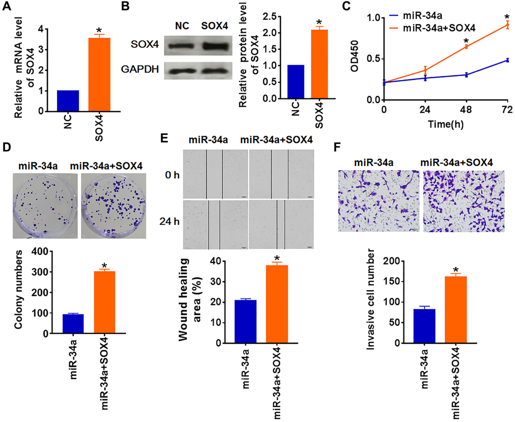 Figure 4. MiR-34a inhibits PTC development by downregulating SOX4. SOX4 or NC was transfected into TCP-1 cells. (A) The mRNA expression of SOX4 was determined by qRT-PCR, (B) and the protein level of SOX4 was tested by Western blot(*p < 0.05). (C) CKK-8 assay was used to examine the cell growth at 0, 24, 48 and 72 h (*p < 0.05). (D) Colony formation assay was used to calculated cell proliferation (*p < 0.05). (E) Wound healing assay was used to detect cell migration (*p < 0.05). (F) Transwell assay was performed to check cell invasive ability (*p < 0.05).