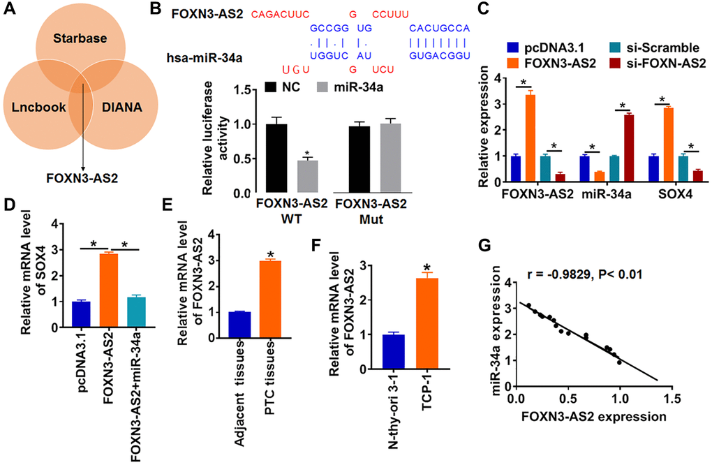 Figure 5. FOXN3-AS2 directly regulates miR-34a and inhibits its expression in PTC. (A) Starbase, LncBook and DIANA databases used to identify the lncRNAs with miR-34a biding sites. (B) WT and mutant miR-34a luciferase plasmids were transfected into HEK293 cells with pcDNA3.1 or FOXN3-AS2. The luciferase activity was measured by dual-luciferase reporter assay system (*p < 0.05). (C) FOXN3-AS2 or si-FOXN3-AS2 or its NC was transfected into TCP-1 cells. The mRNA level of FOXN3-AS2, miR-34a and SOX4 were analyzed by qRT-PCR (*p < 0.05). (D) FOXN3-AS2 and miR-34a were cotransfected into TCP-1 cells, the mRNA level of SOX4 were tested (*p < 0.05). The protein level of miR-34a in PTC tissues (E) and cells (F) was detected by qRT-PCR (*p < 0.05). (G) The correlation analysis of miR-34a and FOXN3-AS2 expression in PTC tissues.