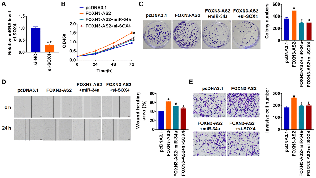 Figure 6. LncRNA FOXN3-AS2 promotes OC progression via miR-34a/SOX4 axis. (A) FOXN3-AS2 plasmid was transfected into TCP-1 cells, and qRT-PCR analysis was used to detect the transfection efficiency (*p < 0.05). miR-34a or si-SOX4 was cotransfected into TCP-1 cells with FOXN3-AS2 plasmid. CCK8 assay (B) and colony formation assay (C) was used to calculate cell proliferation (*p < 0.05 vs. pcDNA3.1, #p < 0.05 vs. FOXN3-AS2). (D) Wound healing assay was used to detect cell migration (*p < 0.05 vs. pcDNA3.1, #p < 0.05 vs. FOXN3-AS2). (E) Transwell assay was performed to check cell invasive ability (*p < 0.05 vs. pcDNA3.1, #p < 0.05 vs. FOXN3-AS2).