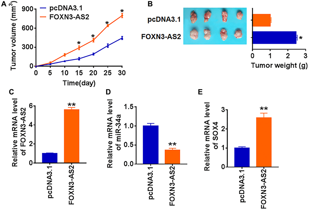Figure 7. LncRNA FOXN3-AS2 promotes in vivo tumor growth in the nude mice. TCP-1 cells line stably expressing FOXN3-AS2 or pcDNA3.1 were subcutaneously injected in right lower limb of the nude mice. (A) The tumor volume was assessed in the nude mice every 5 days (*p < 0.05). (B) Tumor weight was determined in the isolated tumors from the nude mice (*p < 0.05). (C) The relative expression of FOXN3-AS2 was determined by qRT-PCR in the isolated tumor tissues (**p < 0.01). qRT-PCR was performed to detect the relative mRNA expression of miR-34a (D) and SOX4 (E) (*p < 0.05).