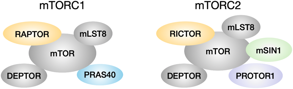 Figure 1. mTORC1 and mTORC2 composition. mTORC1 has core components mTOR, mLST8 and RAPTOR, and is associated with inhibitory regulators DEPTOR and PRAS40. mTORC2 has core components mTOR, mLST8, RICTOR and mSIN1, and is associated with inhibitory regulator DEPTOR and positive regulator PROTOR1.