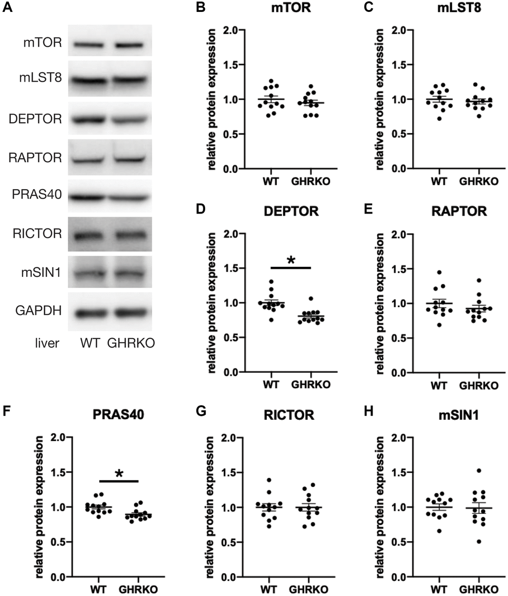 Figure 2. Reduced DEPTOR and PRAS40 protein expression in GHRKO liver. (A) Representative immunoblots of protein expression for mTORC1 and mTORC2 components. (B–H) Quantification of protein expression, for N = 6 male and N = 6 female mice, with mean and SEM. *t-test p-value < 0.05.