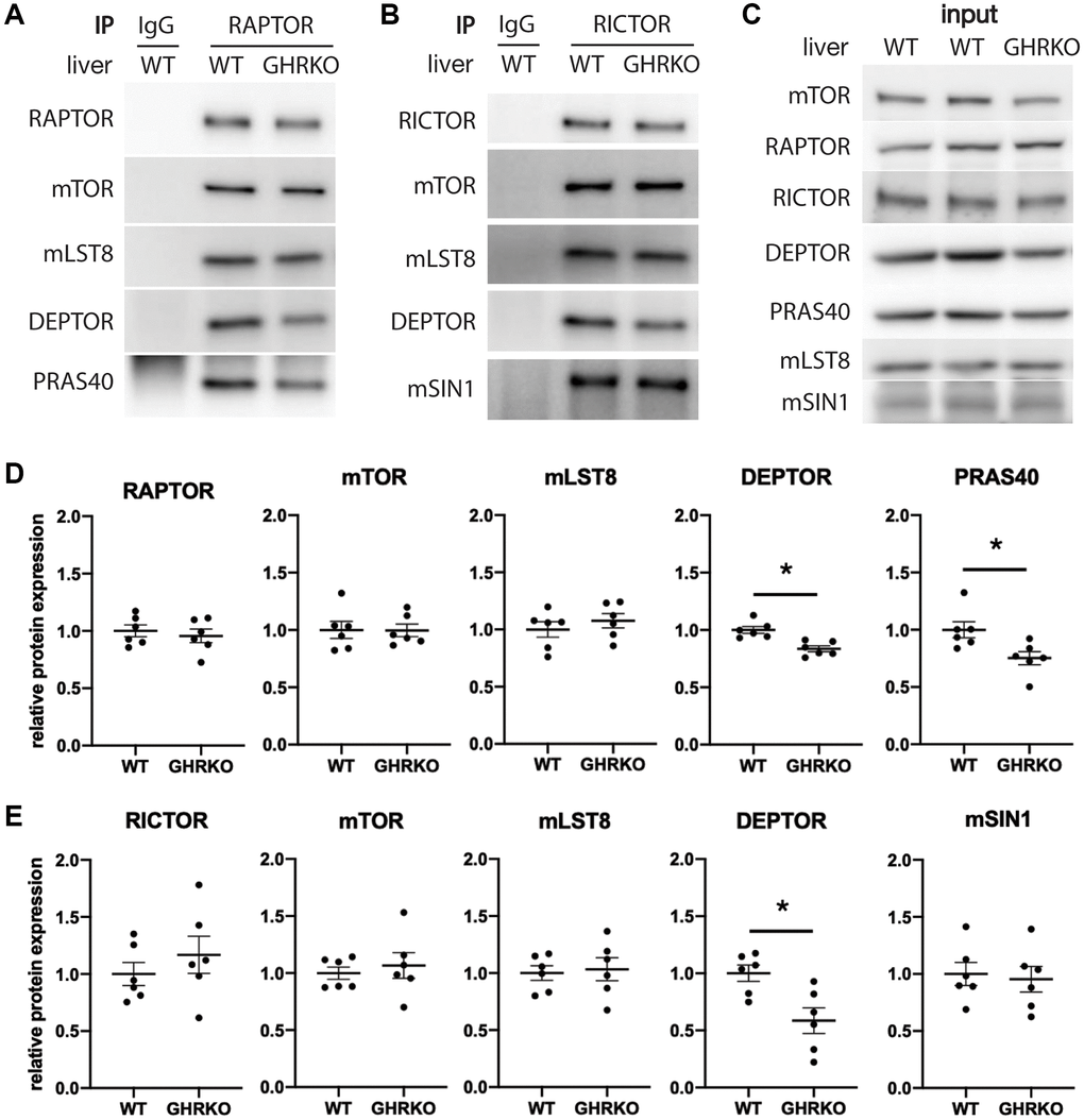 To estimate levels of each component within the mTOR complexes, we carried out immunoprecipitation experiments using antibodies specific for the scaffold protein RAPTOR to pull down mTORC1, and using anti-RICTOR antibody to pull down mTORC2. We measured levels of the mTORC1 components mTOR, mLST8, DEPTOR and PRAS40 in the RAPTOR IP samples from control and GHRKO liver, and found lower levels of DEPTOR and PRAS40 in mTORC1 immunoprecipitated from GHRKO compared to controls, which is consistent with the findings from whole liver lysates (Figure 3A, 3D). RICTOR IP samples from GHRKO mice contained less DEPTOR but had unaltered expression of the other components mTOR, mLST8, and mSIN1 (Figure 3B, 3E). This suggests that not only are levels of DEPTOR and PRAS40 reduced in the GHRKO liver, Figure 3C shows lysates prior to immunoprecipitation, which, as expected, recapitulate the findings presented in Figure 2. But that the amounts of these proteins are also reduced in mTOR complexes compared to wildtype mice.