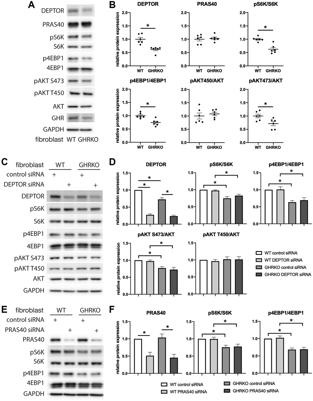 Figure 4. mTORC1 or mTORC2 substrates are not regulated by DEPTOR or PRAS40 knockdown in GHRKO cells. (A) Representative immunoblots of the protein expression in GHRKO cells. (B) Quantification of the protein levels in a series of experiment as in (A). (C, D) Protein expression of mTORC1 and mTORC2 substrates in DEPTOR knockdown cells. (E, F) Protein expression of mTORC1 substrates in PRAS40 knockdown cells. N = 6. (*) for t-test p < 0.05.