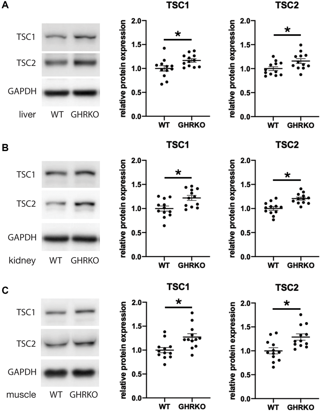 Figure 5. TSC1 and TSC2 are increased in GHRKO tissues. TSC1 and TSC2 protein expression in GHRKO liver (A), kidney (B), and muscle (C). N = 6 male and N = 6 female mice. *t-test p < 0.05.