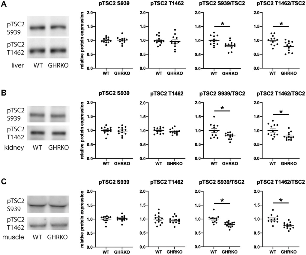 Figure 6. Relative phosphorylation of TSC2 is decreased in GHRKO tissues. The relative TSC2 phosphorylation at two sites S939 and T1462 was decreased in GHRKO liver (A), kidney (B), and muscle (C). N = 6 male and N = 6 female mice. *t-test p < 0.05.