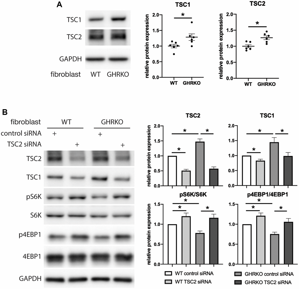 Figure 7. Upregulation of mTORC1 substrates by TSC2 knockdown in GHRKO cells. (A) TSC1 and TSC2 protein expression in GHRKO cells. (B) Protein expression of mTORC1 substrates in TSC2 knockdown cells. N = 6. *t-test p < 0.05.