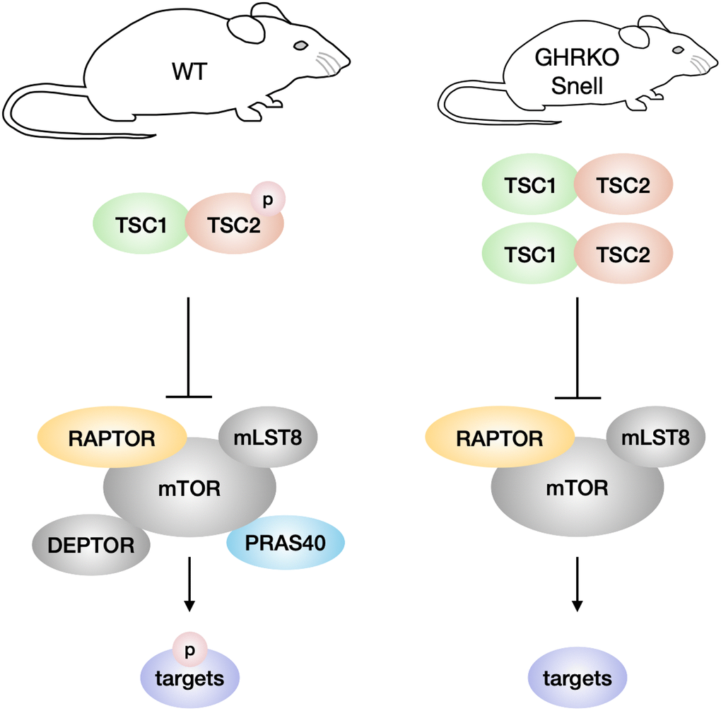 In summary, this study highlights the potential role of TSC in regulating mTORC1 activity in long-lived mutant mice. Given the fact that deficient mTORC1 signaling extends lifespan in different species including mice, the regulation of mTOR complexes may be one of the reasons for extended lifespan of GHRKO and Snell dwarf mice. Inhibiting TSC in these mice would be helpful to know whether TSC inhibits mTORC1 activity in vivo, and whether reversing mTORC1 activity also abolishes the lifespan extension of GHRKO and Snell dwarf mice. Future studies on enhancing TSC function by overexpressing TSC2 or using TSC2 activating molecules may generate additional mouse models that can be used as comparisons with GHRKO and Snell dwarf mice, which would provide more evidence about the negative role of mTOR in aging.