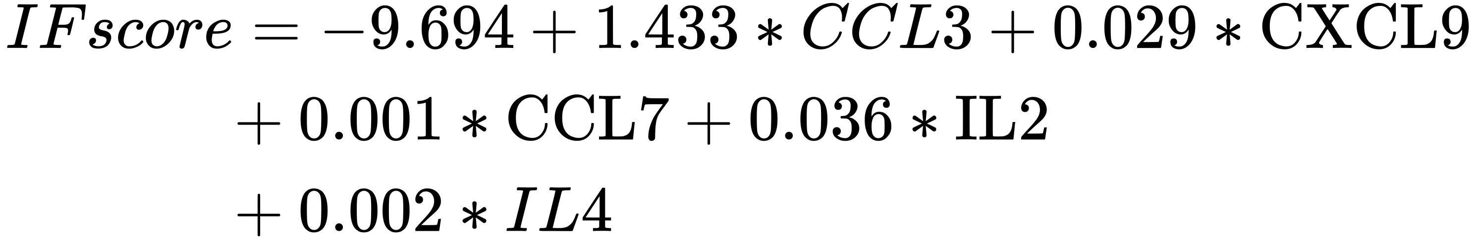 Previously, we identified 32 differential IFs. Then, we used the random forest to select 5 representative IFs with important points (CCL3, CXCL9, CCL7, IL2, IL4; Figure 8A). Next, the LASSO regression analysis was performed to develop an IFscore model (Figure 8B). The following formula established the score.