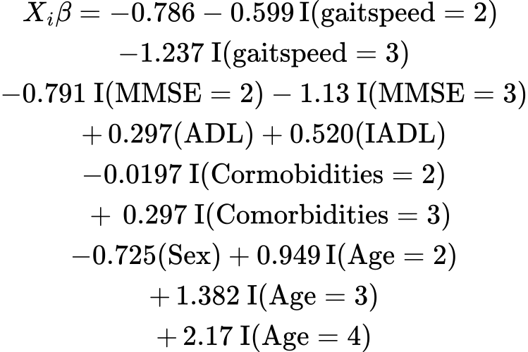 with Xiβ, the linear predictor of the logit (log odds) of the 5-years mortality probability: