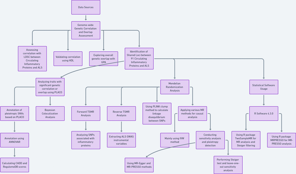 Genome-wide association studies (GWAS) represent a potent tool for elucidating the genetic underpinnings of complex diseases. By analyzing genetic data from large cohorts of cases and controls, GWAS have the capacity to identify genetic variants associated with disease risk. In ALS research, GWAS have successfully pinpointed multiple genetic loci linked to disease risk [9–11]. However, existing research on the genetic correlation and potential causality between circulating inflammatory proteins and ALS is still insufficient.