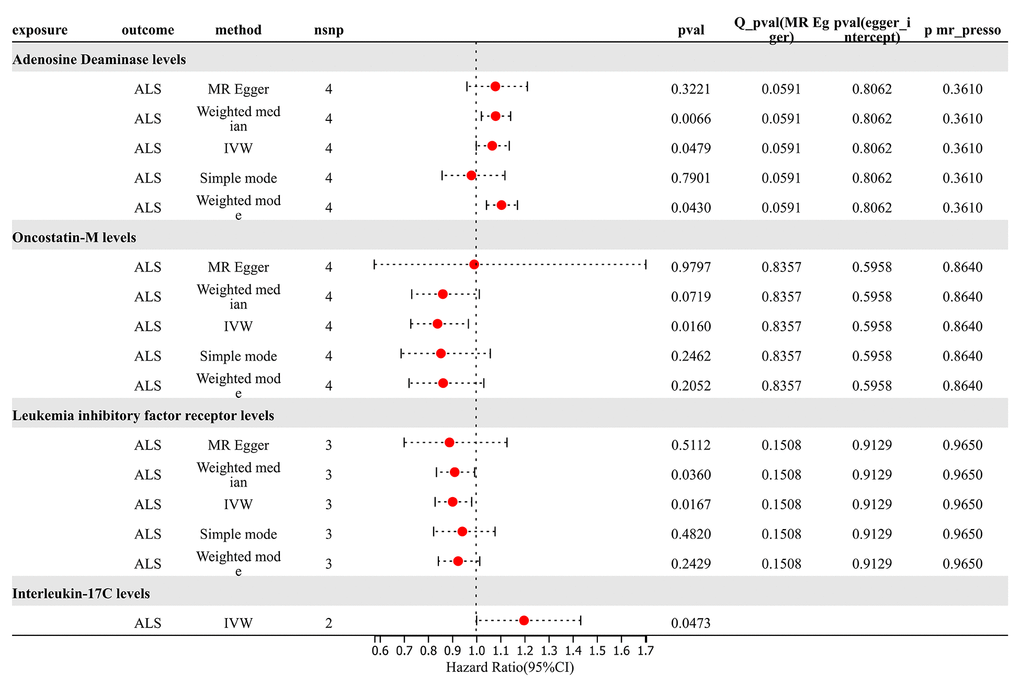 For analysis of TSMR results for inflammatory proteins and ALS, SNP (P < 5×10^-8) was chosen as the threshold to extract instrumental variables, and 73 inflammatory proteins were included in the TSMR analysis. The results indicated that elevated levels of Adenosine Deaminase increase the risk of ALS (OR=1.066, PIVW = 0.048). Elevated levels of Interleukin-17C were associated with an increased risk of ALS (OR=1.198, PIVW = 0.047) (SNPs < 3). Increased levels of Oncostatin-M were associated with a decreased risk of ALS (OR=0.840, PIVW = 0.016). Increased levels of Leukemia Inhibitory Factor Receptor were associated with a decreased risk of ALS (OR=0.903, PIVW = 0.017). The analysis indicated no significant heterogeneity (Q p-value > 0.05) or horizontal pleiotropy (P Egger Intercept > 0.05) for all the results (Figure 6 and Supplementary Table 7).